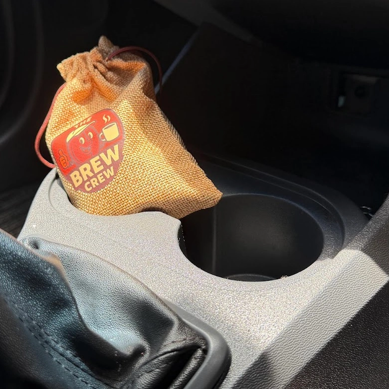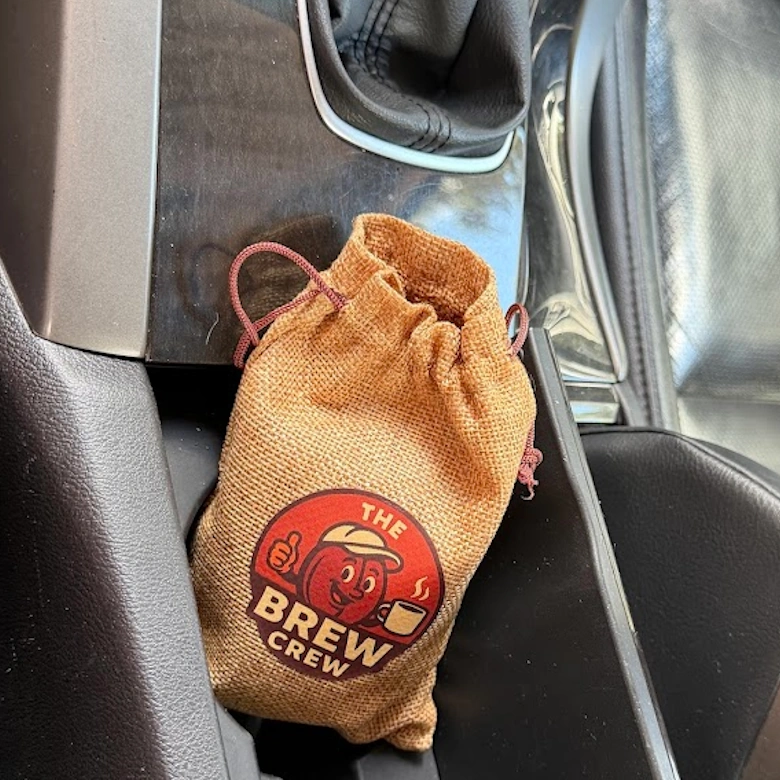 Meet The Brew Crew Mini Burlap Bag, a fun, eco-conscious way to keep your car smelling irresistibly like freshly brewed coffee.