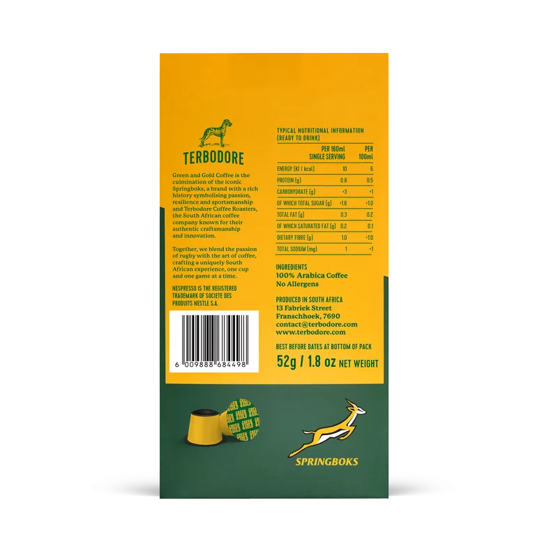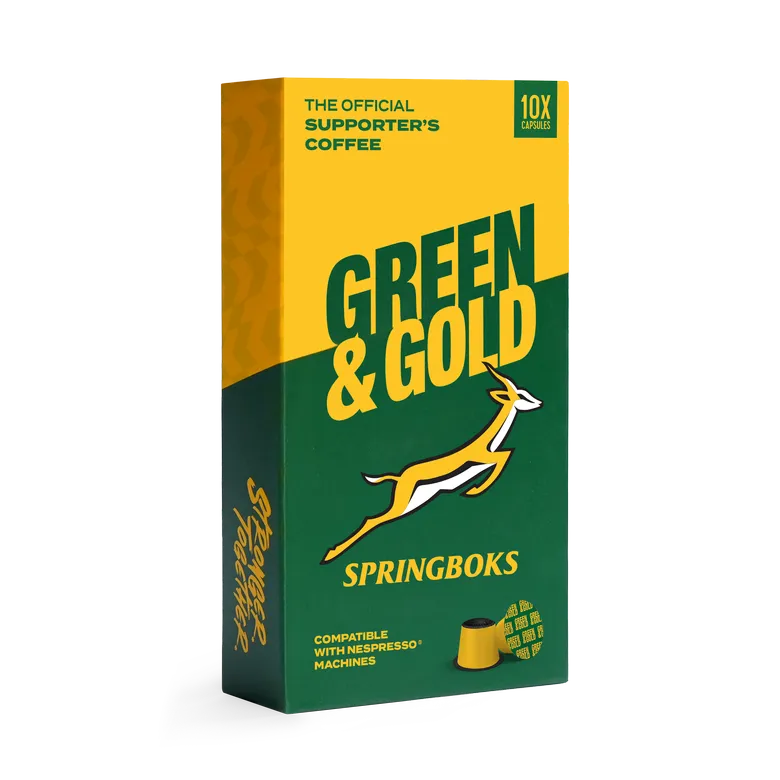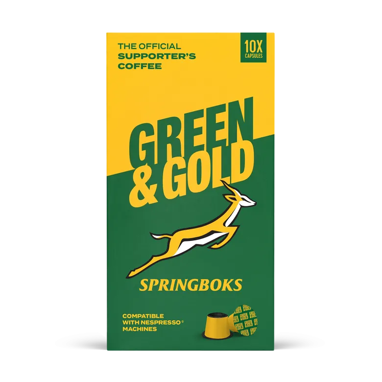 Support the Boks with Green & Gold, the official Springboks coffee from Terbodore in South Africa, available in Nespresso compatible pods for your convenience
