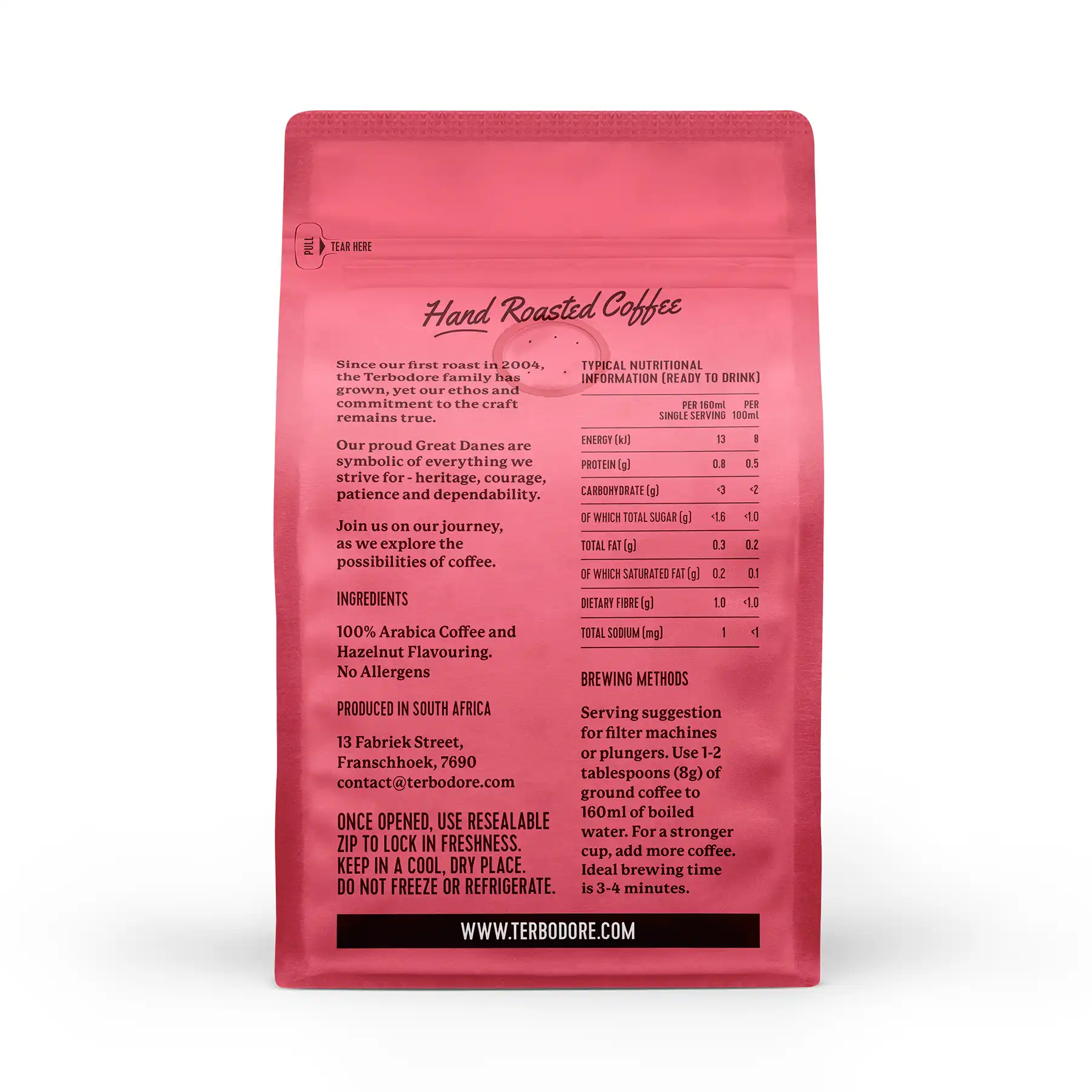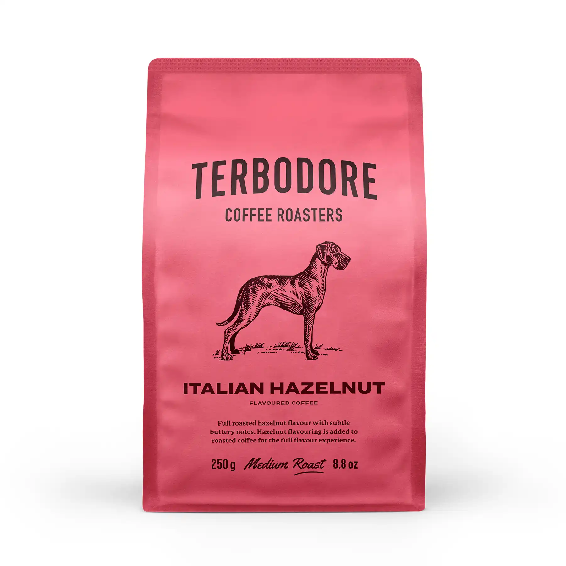 Flavour is carefully added after roasting – Terbodore’s expert method that preserves the full, rich character and natural smoothness of premium Arabica beans, allowing the hazelnut to complement and enhance the coffee base perfectly. No sugar is added to the flavouring, so you enjoy clean, authentic richness – add your own milk, cream, or sweetener to create the ultimate hazelnut latte or cappuccino.