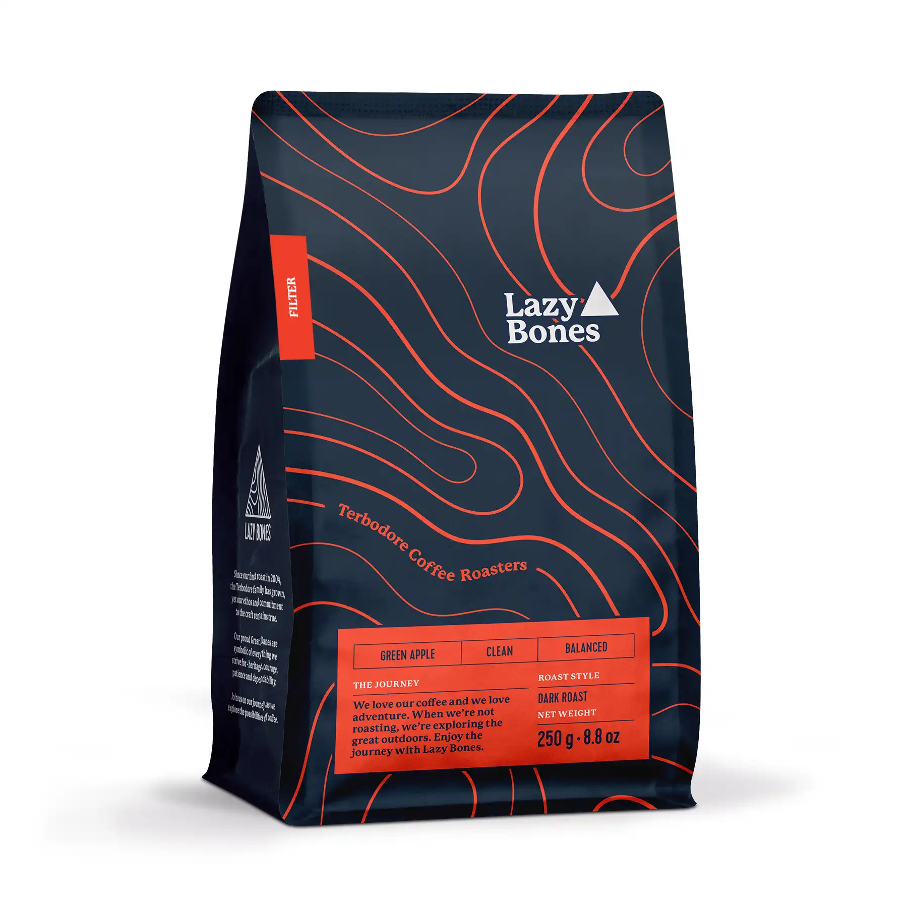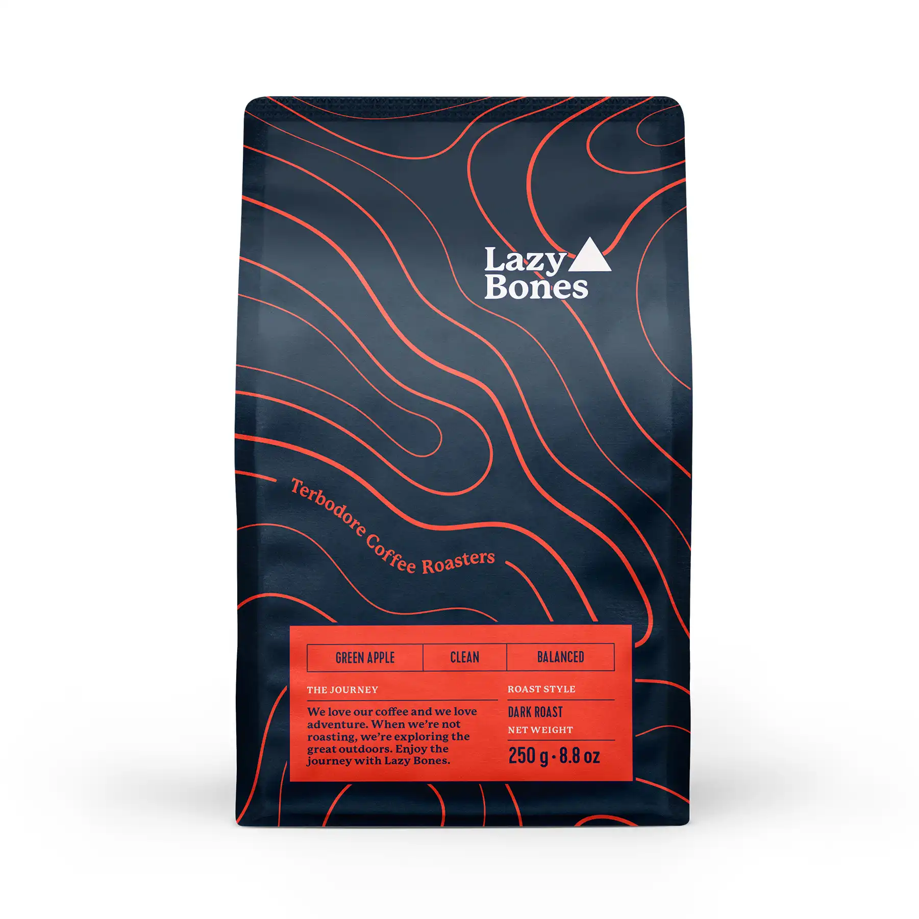 Shop Lazy Bones today and embrace the journey with this bold, green apple–kissed dark roast from Terbodore Coffee Roasters crafted for those who explore, roam, and never compromise on great coffee.