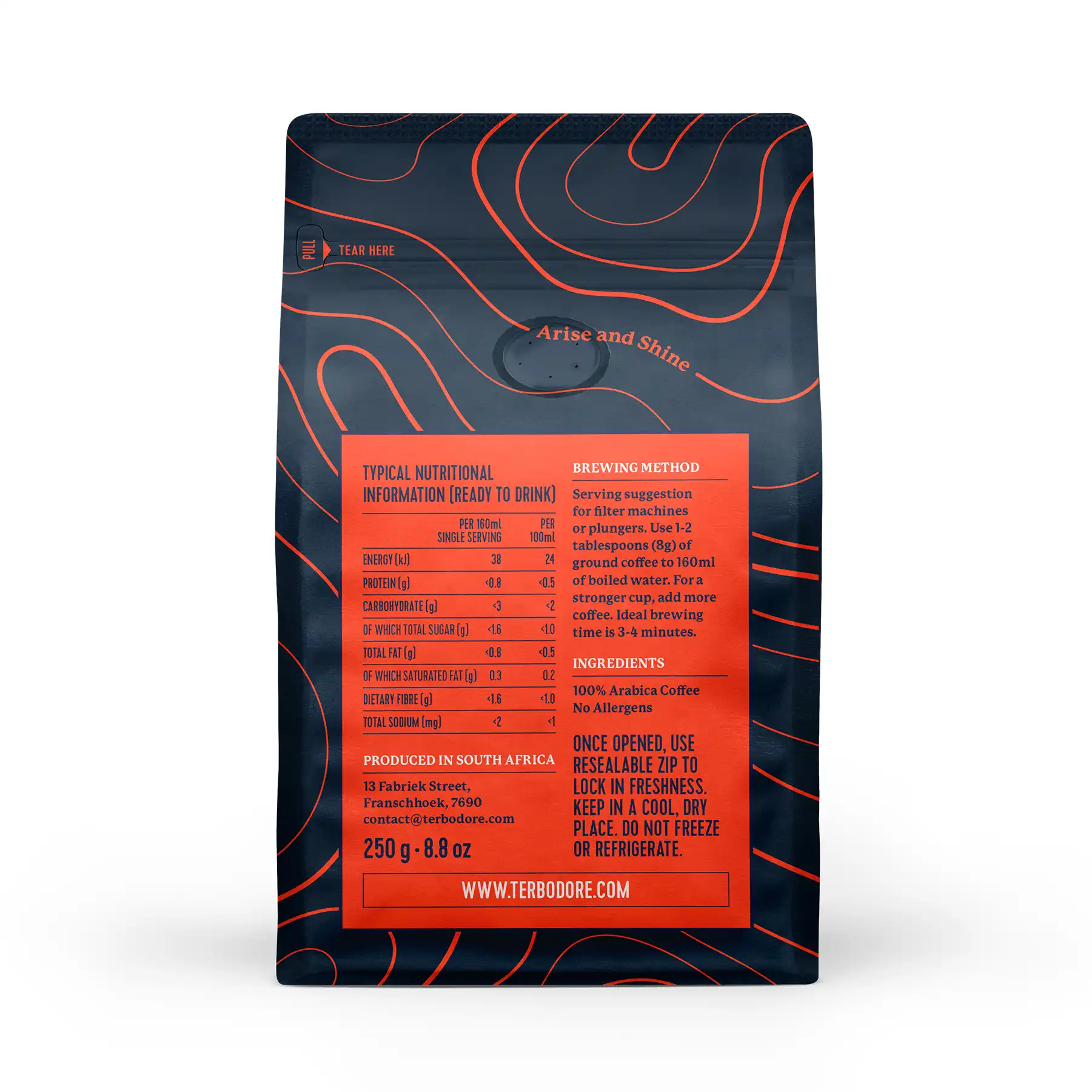 Terbodore Lazy Bones is the signature dark roast blend from Terdobore Coffee Roasters, hand-roasted in small batches in the heart of Franschhoek, South Africa. Born from a deep-rooted love of exceptional fresh coffee and the spirit of the great outdoors, this adventure-ready blend embodies the ethos of the Lazy Bones range: uncompromising quality for those who live life on the move and savour every moment along the way.