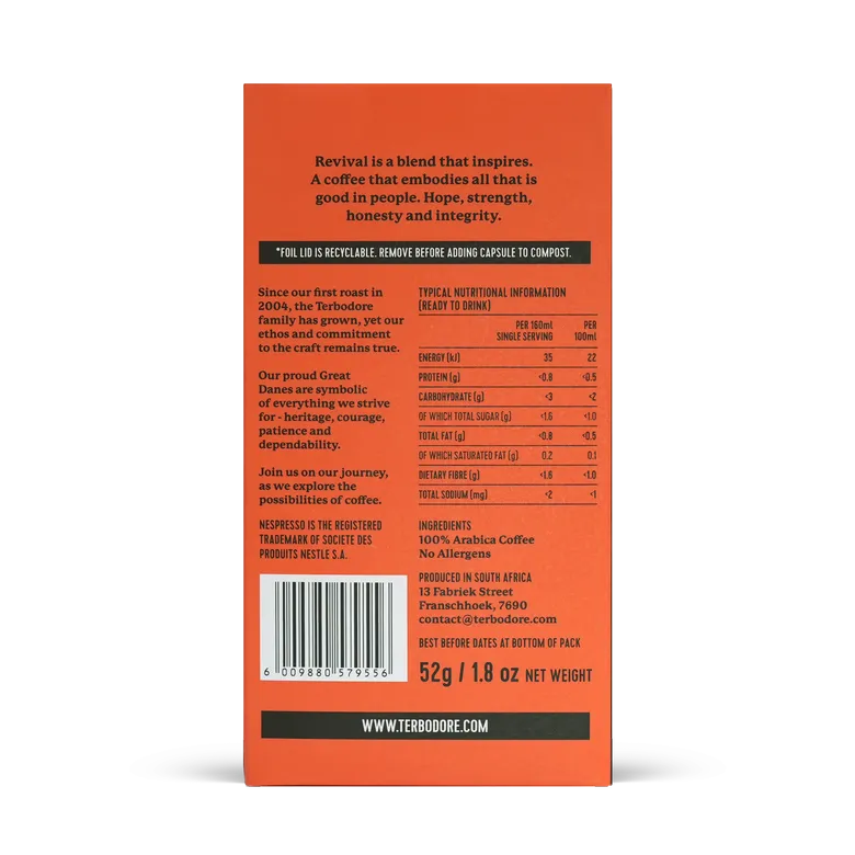 Discover Revival – a meaningful medium/dark roast blend from Terbodore Coffee Roasters, hand-roasted in small batches in Franschhoek, South Africa. This heritage blend, reimagined for contemporary tastes, is more than just coffee – it’s a celebration of positivity and community. A percentage of every purchase is donated to local initiatives, reflecting values of hope, strength, honesty, and integrity.