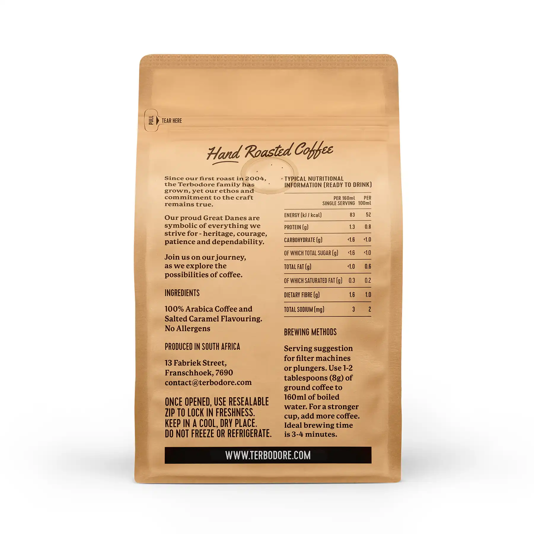 Terbodore Coffee Roasters is a passionate, family-run South African brand that has been crafting exceptional coffee since 2004. Starting as a humble roastery in the scenic KwaZulu-Natal Midlands and expanding to Franschhoek, they remain dedicated to roasting premium beans with authenticity, care, and a love for the craft. From bold single origins and expertly balanced blends to indulgent flavoured options, every batch is roasted fresh to deliver rich, great-tasting coffee that’s perfect for your way. Terbodore is South Africa’s go-to for quality coffee that brings people together!