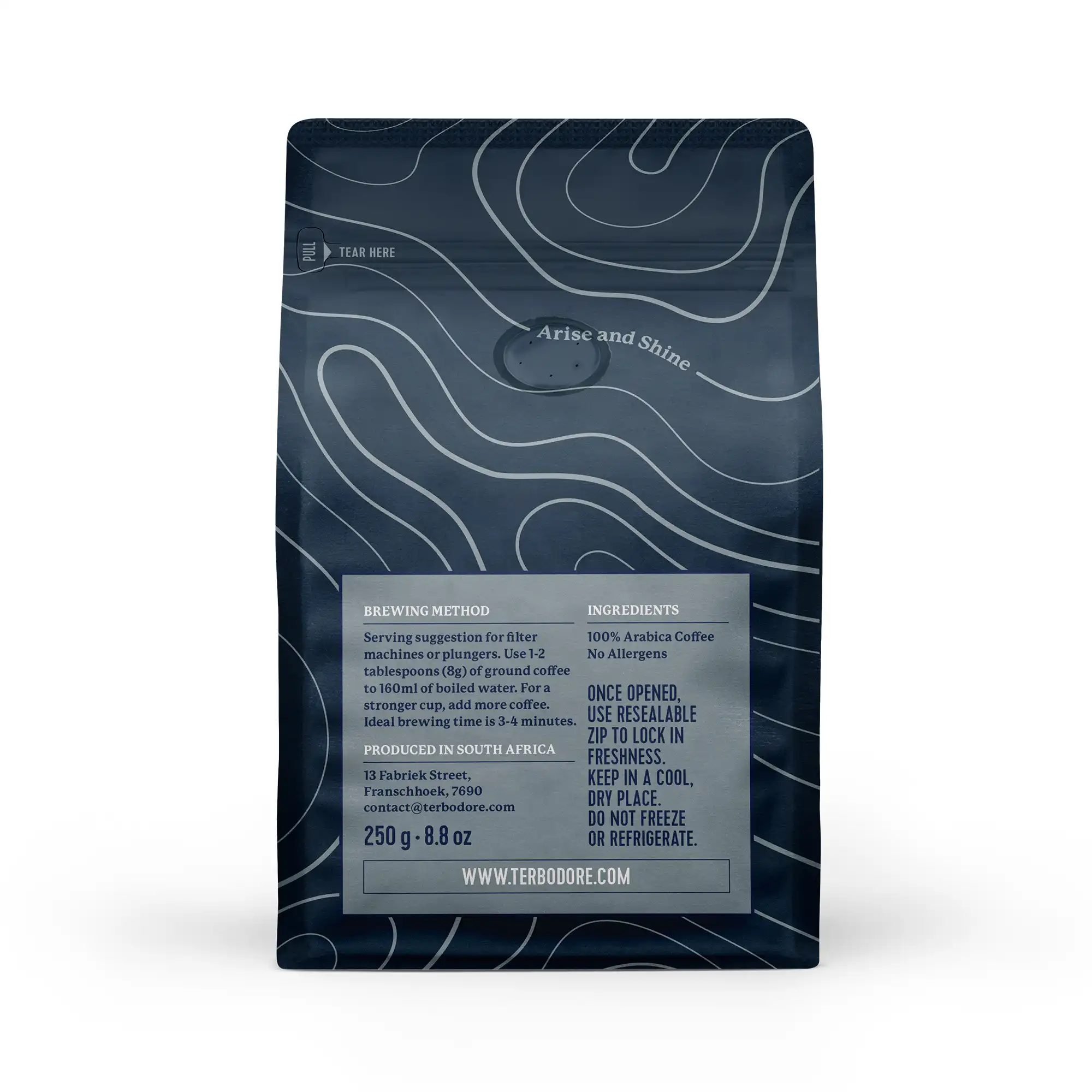 • Packaging Options: 250g bags (whole bean or ground: Beans, Plunger, Filter, Home Espresso); 100% recyclable packaging